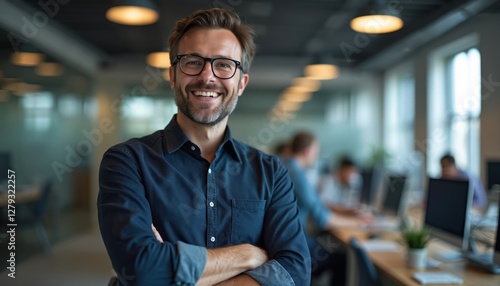 Wall mural portrait of smiling programmer man wearing eyeglasses in office. confident developer, engineer with  - Wall murals Wall mural portrait of smiling programmer man wearing eyeglasses in office. confident developer, engineer with - Wall murals