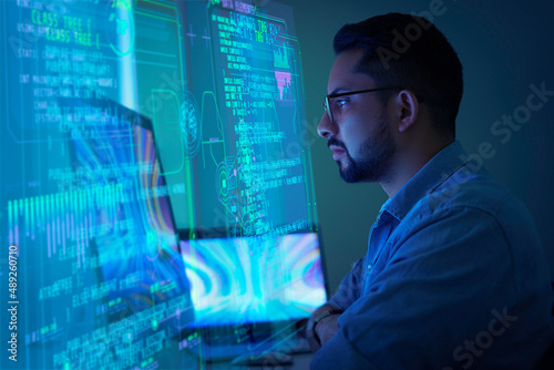 Wall mural : Portrait of software developer / hacker wearing glasses sitting at his desk and working on futuristi