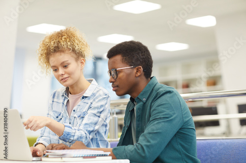 The watermark will not be included on Wall mural.: Portrait of two students pointing at laptop screen while working on project in college library, copy