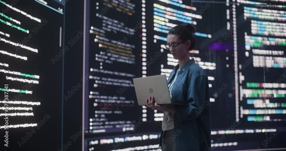 Wall mural portrait of young woman working on laptop computer, looking at big digital screen displaying back-en - Wall murals Wall mural portrait of young woman working on laptop computer, looking at big digital screen displaying back-en - Wall murals