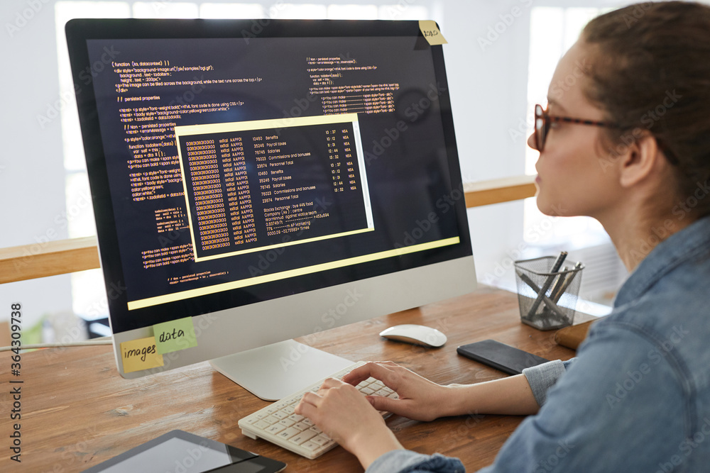 The watermark will not be included on Wall mural.: Portrait of young woman writing programming code on computer screen while working at desk in contemp