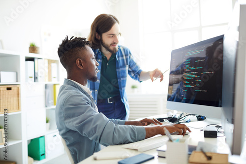 Wall mural positive skilled young multiethnic coders in casual clothing discussing computer language: smiling b
