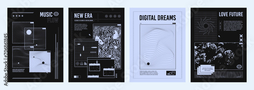 Wall mural : Poster or cover design in y2k aesthetic style in black and blue colors with abstract grid shapes and