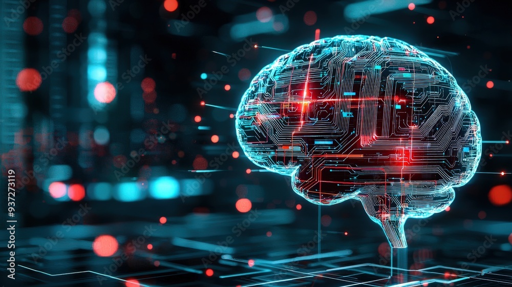 Wall mural poster with a stylized brain circuit filled with lines of swift code symbolizing creativity and inno