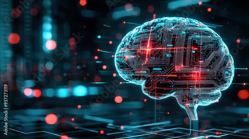 The watermark will not be included on Wall mural.: Poster with a stylized brain circuit filled with lines of swift code symbolizing creativity and inno
