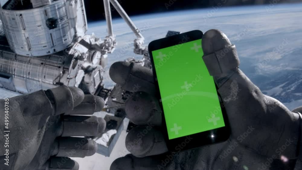 Pov first person view through the astronaut helmet, astronaut using his mobile phone during the spacWall mural