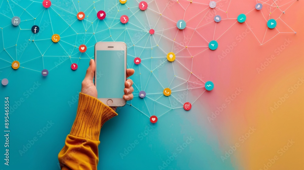 Pov image showing a hand holding a mobile phone with a blank white screen open to a social media appWall mural