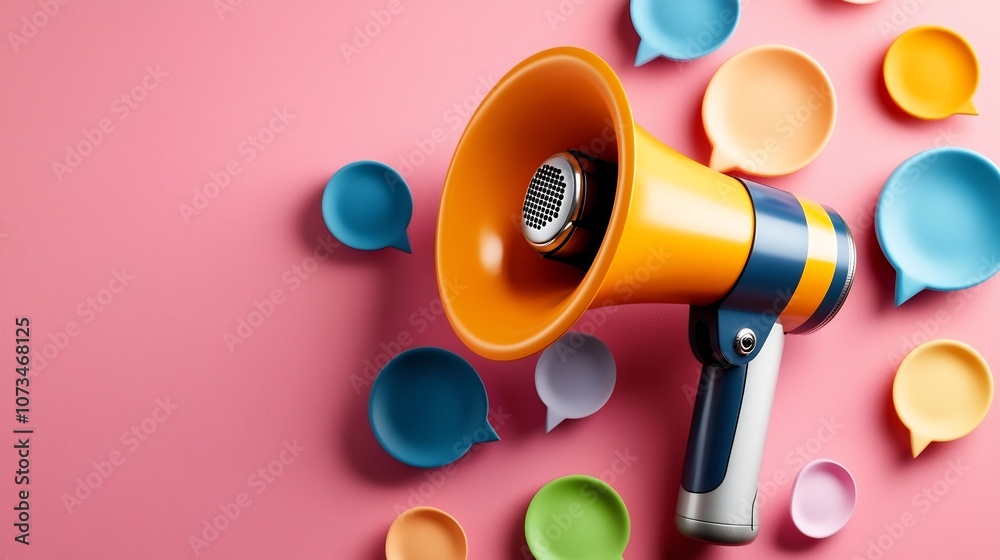 Wall mural powerful 3d megaphone in the center surrounded by speech bubbles of varying colors and sizes scatter