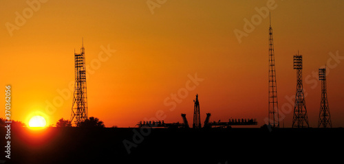 Wall mural pre-launch of spaceship in the spaceport. silhouette of space shuttle at dusk. mixed media