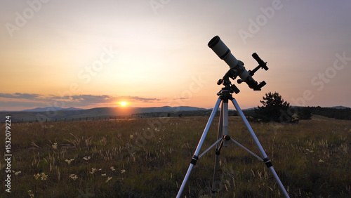 Wall mural preparing for night sky observing with a astronomical telescope just before sunset in the countrysid
