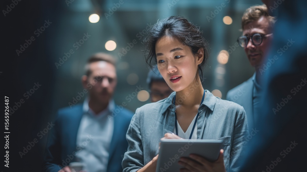 Wall mural : Presentation moment of asian manager explaining data on tablet during team discussion, room for text