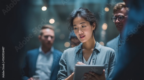 Wall mural presentation moment of asian manager explaining data on tablet during team discussion, room for text - Wall murals Wall mural presentation moment of asian manager explaining data on tablet during team discussion, room for text - Wall murals