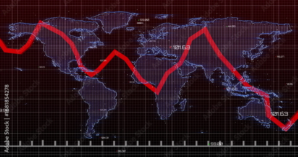 Presenting dotted world map with red zigzag trend line on dark red grid, with numeric labelsWall mural