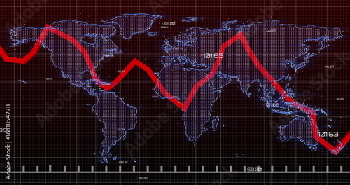 Wall mural : Presenting dotted world map with red zigzag trend line on dark red grid, with numeric labels