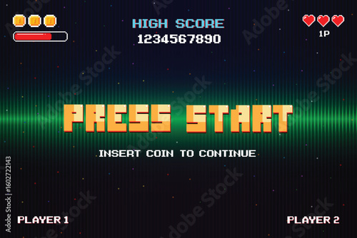 The watermark will not be included on Wall mural.: Press start - insert a coin to continue - pixel art - 8 bit game - retro game - for game assets - retro fu