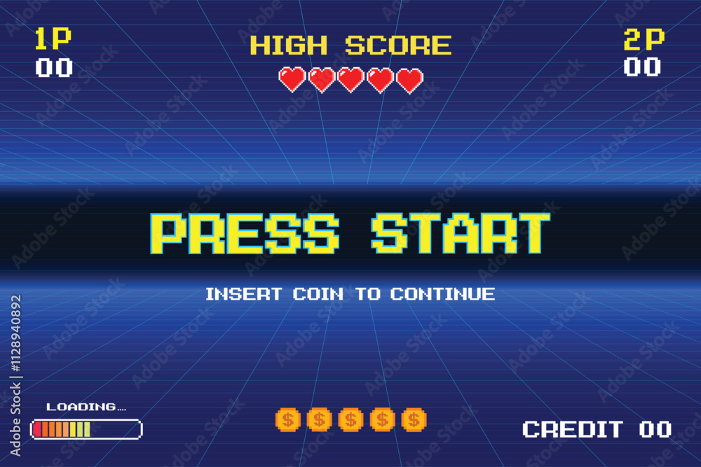 The watermark will not be included on Wall mural.: Press start - insert coin to continue - pixel art 8-bit game retro game - retro futurism sci-fi backgro