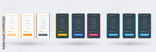 Wall mural : Pricing table design template for websites and applications - set of three different color variations