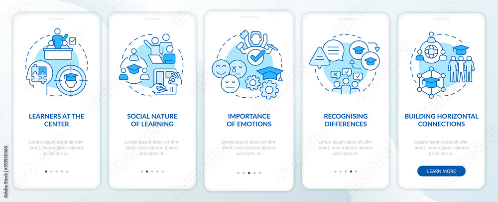 Principles and laws of learning blue onboarding mobile app screen - walkthrough 5 steps editable grapWall mural