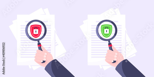 Wall mural privacy policy, safety lock and data protection metaphor set. hand hold magnifier shield with padloc