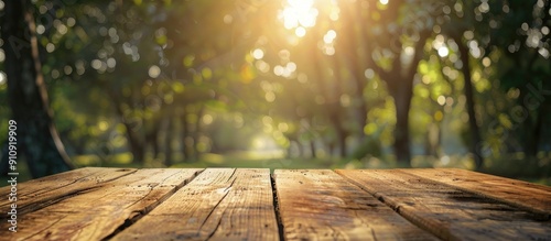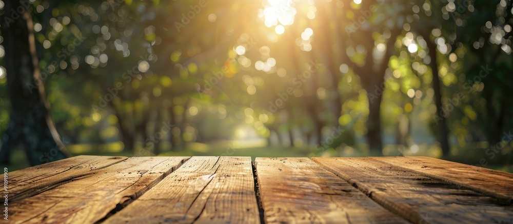Wall mural : Product displayed on a wooden table with a blurred background of trees with bokeh effect providing a