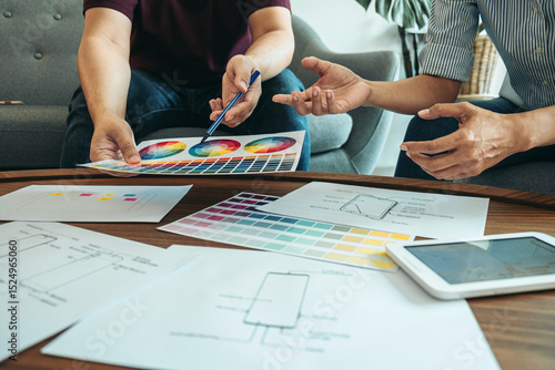 Wall mural professional creative team of web/graphic designer planning, drawing website ux app for mobile phone