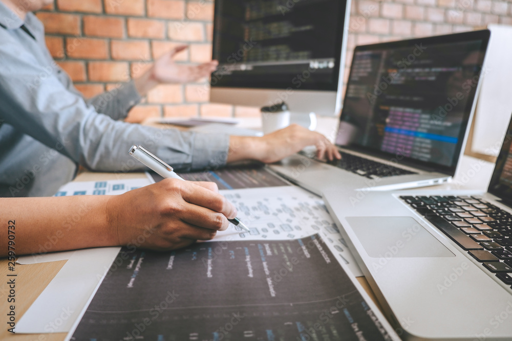 Wall mural : Professional developer programmer cooperation meeting and brainstorming and programming in website w