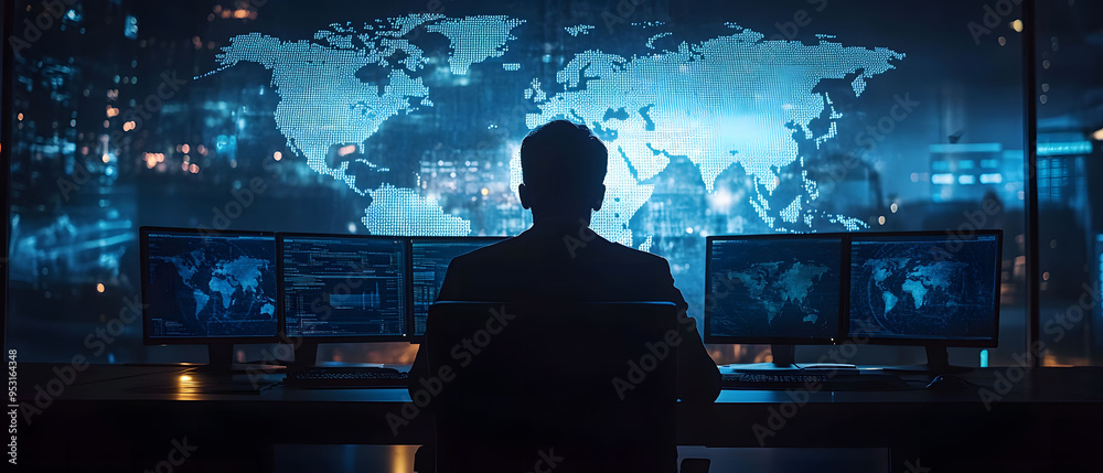 Wall mural professionals sitting at their desks, analyzing global data on computer screens with large monitors  - Wall murals Wall mural professionals sitting at their desks, analyzing global data on computer screens with large monitors - Wall murals