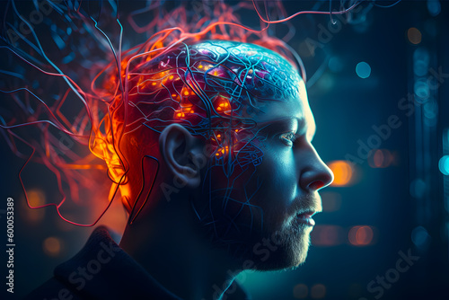The watermark will not be included on Wall mural.: Profile of a male head connected by neurons to a computer processor server using connections abstrac