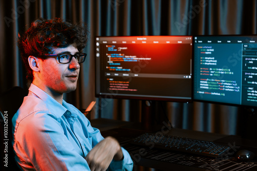 The watermark will not be included on Wall mural.: Profile of smiling it developer sitting against software development information on screen, looking