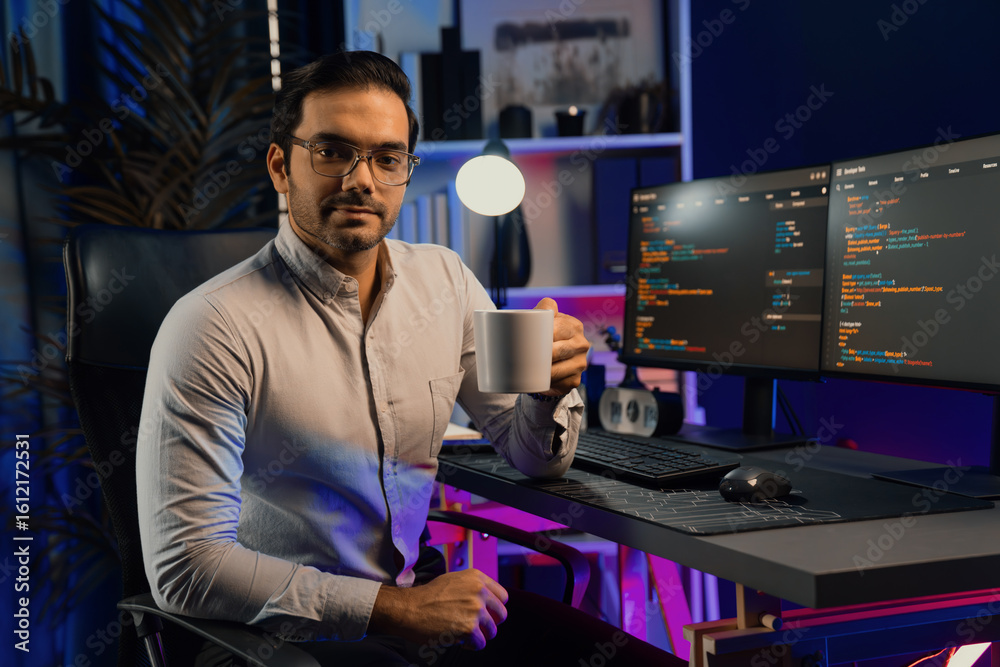 The watermark will not be included on Wall mural.: Profile smart it developer looking camera holding coffee cup against on software development coding