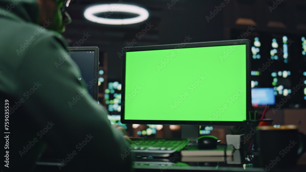 Wall mural programer typing codes mockup computer night room closeup. it technician coding