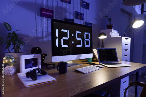 Wall mural programmer's desk with computer and laptop in office at night