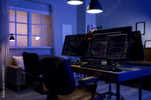 The watermark will not be included on Wall mural.: Programmer's desk with computer monitors and glowing lamps in dark office at night