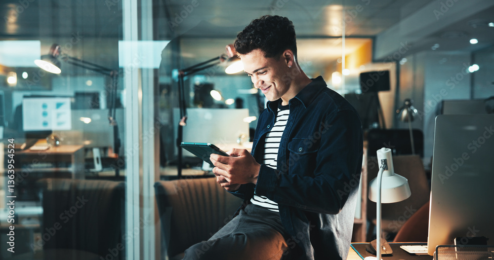 The watermark will not be included on Wall mural.: Programmer, idea and tablet with feedback, research and overtime work for data analysis - web design,