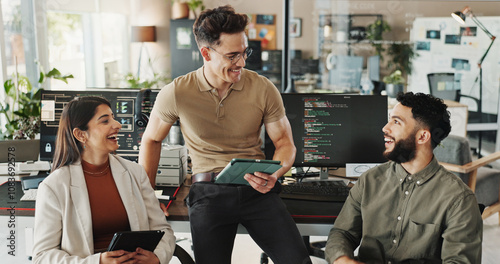 The watermark will not be included on Wall mural.: Programmer, tablet and planning with business people in office for website developer, coding bootcam
