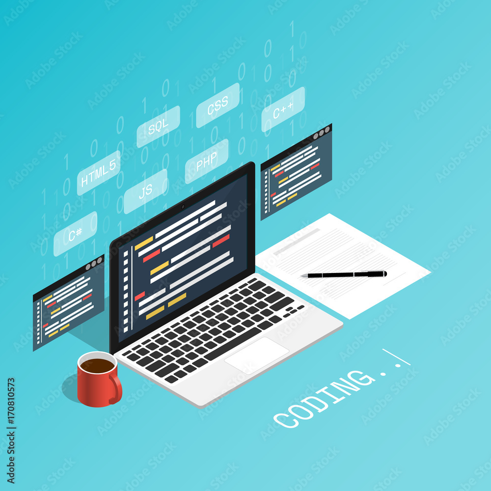 Wall mural programmer coding binary computer,programmer skill isometric flat vector - Wall murals Wall mural programmer coding binary computer,programmer skill isometric flat vector - Wall murals