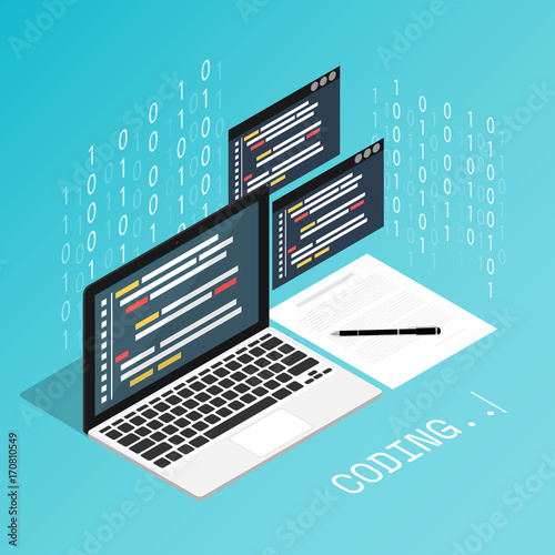 The watermark will not be included on Wall mural.: Programmer coding binary computer isometric flat vector