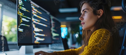 The watermark will not be included on Wall mural.: Programmer coding software, businesswoman working on computer in office -