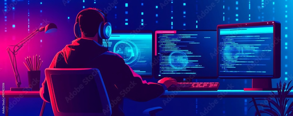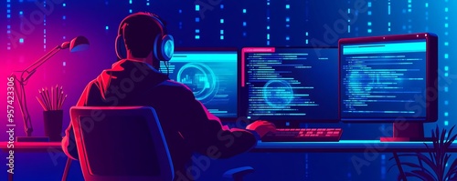 The watermark will not be included on Wall mural.: Programmer debugging with holograms, modern workspace, blue and dark tones