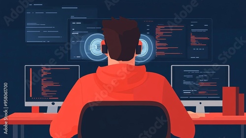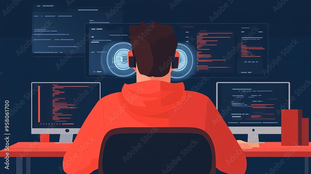 The watermark will not be included on Wall mural.: Programmer debugging with holograms, virtual performance screens, modern tech setup