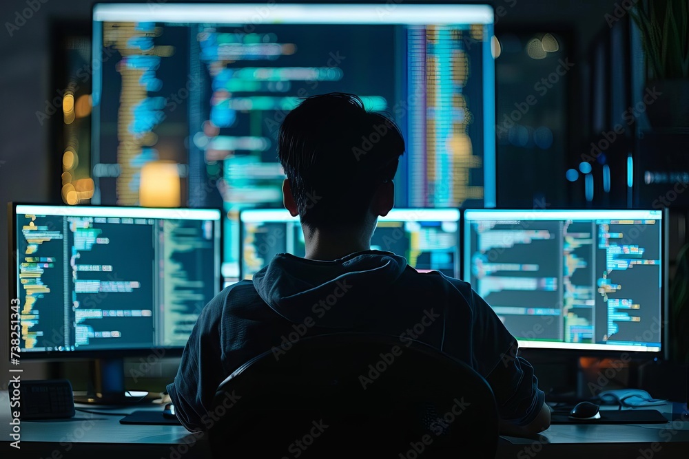 Wall mural programmer developing software. technology and coding on computer screens