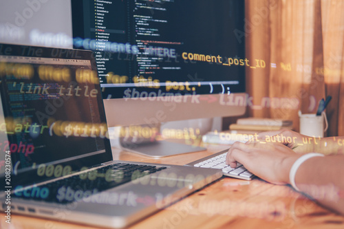 The watermark will not be included on Wall mural.: Programmer hands working at home with computer - man writing a code - men programmer hands on the keyb