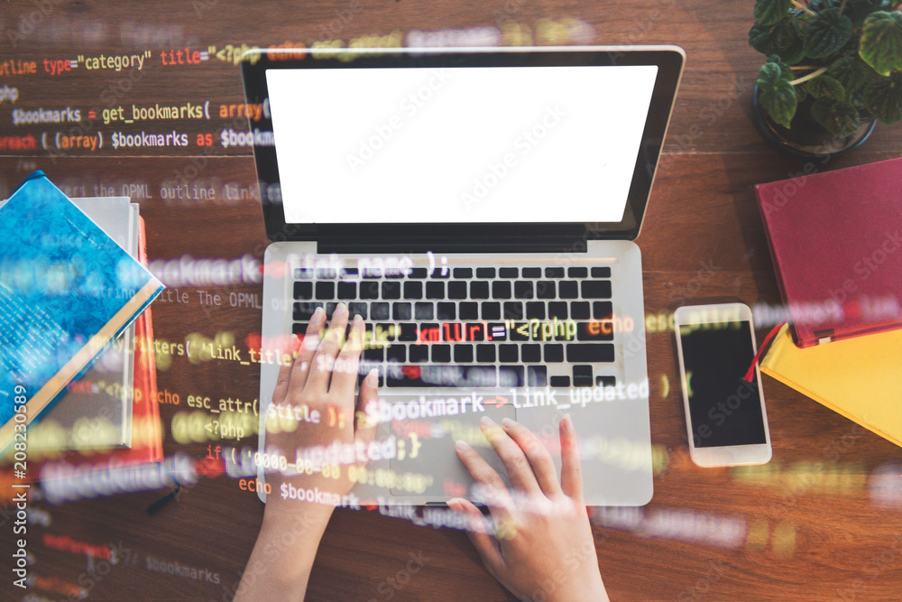 Wall mural programmer hands working at home with computer. woman writing a code. female programmer hands on the - Wall murals Wall mural programmer hands working at home with computer. woman writing a code. female programmer hands on the - Wall murals
