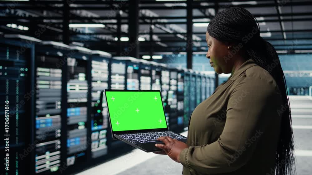 The watermark will not be included on Wall mural.: Programmer in data center using app on isolated screen laptop to ensure error free mainframes networ