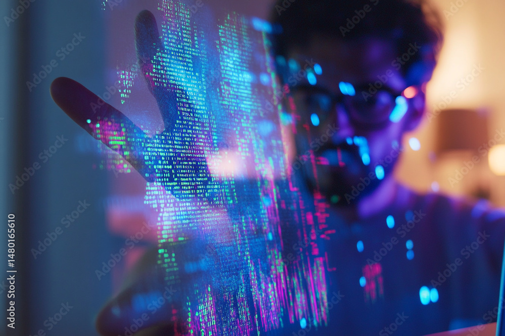 Wall mural programmer interacting with digital code glowing hand futuristic technology - Wall murals Wall mural programmer interacting with digital code glowing hand futuristic technology - Wall murals