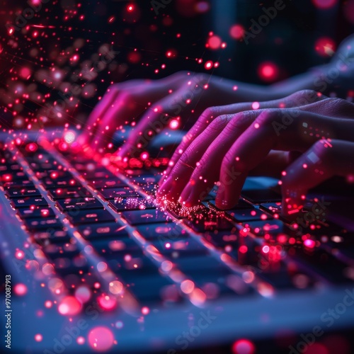 The watermark will not be included on Wall mural.: Programmer typing futuristic code on laptop keyboard with red lights