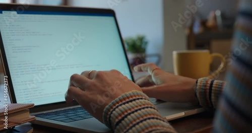 Wall mural : Programmer woman hands using laptop computer typing programming code software engineer student devel