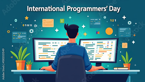 The watermark will not be included on Wall mural.: Programmer working at desk: focused software developer coding on multiple monitors with modern inter