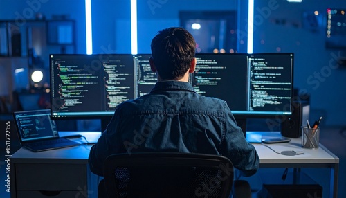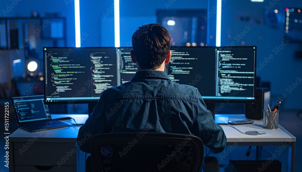 The watermark will not be included on Wall mural.: Programmer working late night coding on multiple screens software development computer screen blue l