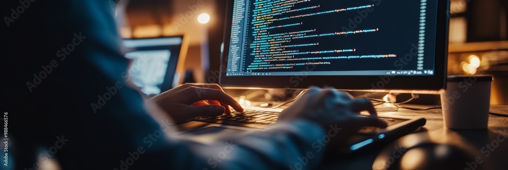 Wall mural programmer working late on code in a quiet home office with dim lighting. focus on software developm - Wall murals Wall mural programmer working late on code in a quiet home office with dim lighting. focus on software developm - Wall murals